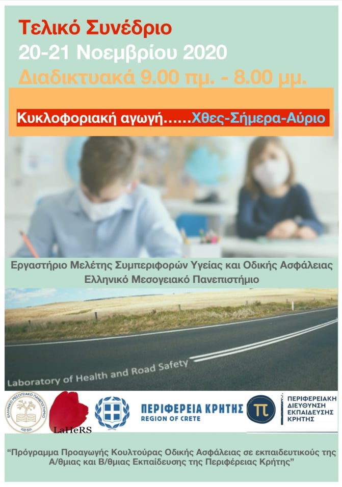 Το Παιδικό Ραδιοφώνο Family Fm 89.5 συμμετέχει στο Πανελλήνιο Συνέδριο Κυκλοφοριακής Αγωγής “Προαγωγή Κουλτούρας Οδικής Ασφάλειας στους Εκπαιδευτικούς Α/θμιας και Β/θμιας Εκπαίδευσης της Περιφέρειας Κρήτης”, το οποίο διεξάγεται διαδικτυακά στις 20 και 21 Νοεμβρίου 2020, υπό την επιστημονική ευθύνη του Εργαστηρίου Μελέτης Συμπεριφορών Υγείας και Οδικής Ασφάλειας (LaHeRS) του Ελληνικού Μεσογειακού Πανεπιστημίου και με την υποστήριξη της Περιφέρειας Κρήτης και της Περιφερειακής Δ/νσης Εκπαίδευσης Κρήτης.