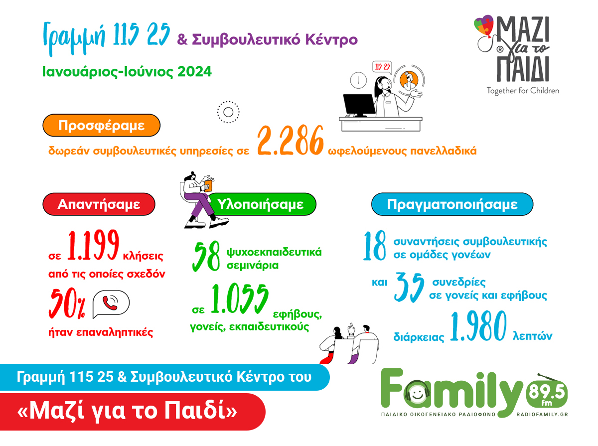 Η Γραμμή 115 25 & το Συμβουλευτικό Κέντρου του Μαζί για το Παιδί, μέσω των δωρεάν υπηρεσιών του, στήριξε 2.286 γονείς, εκπαιδευτικούς και εφήβους πανελλαδικά το πρώτο εξάμηνο του 2024.