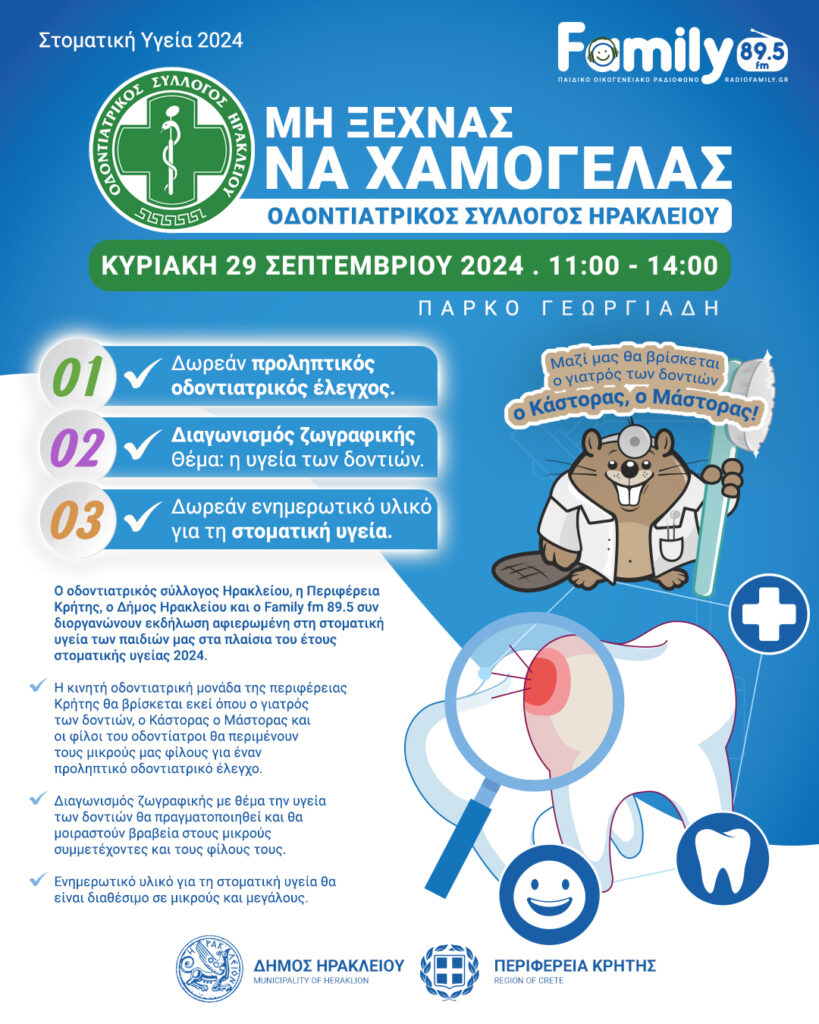 Ο οδοντιατρικός σύλλογος Ηρακλείου, η Περιφέρεια Κρήτης, ο δήμος Ηρακλείου και ο Family fm 89.5 συν διοργανώνουν εκδήλωση αφιερωμένη στη στοματική υγεία των παιδιών μας στα πλαίσια του έτους στοματικής υγείας 2024.