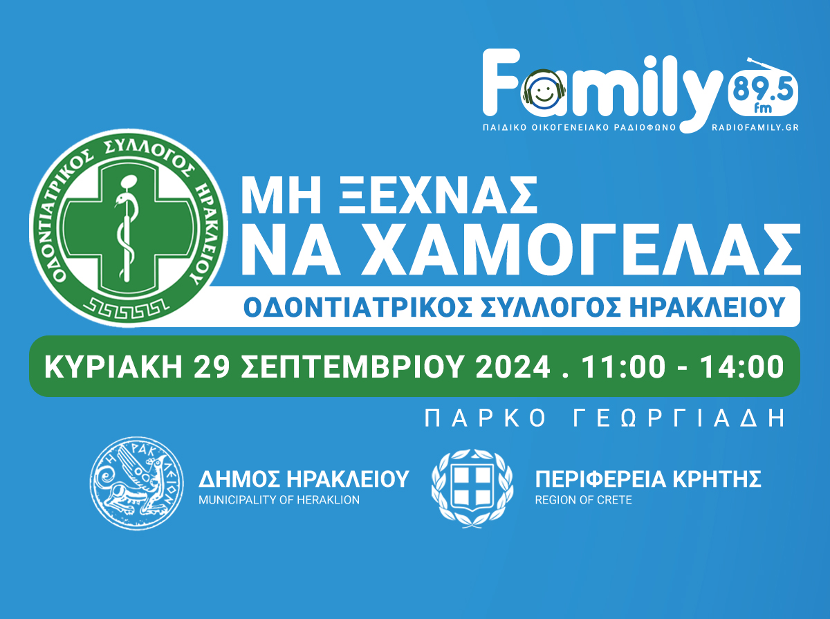 Ο οδοντιατρικός σύλλογος Ηρακλείου, η Περιφέρεια Κρήτης, ο δήμος Ηρακλείου και ο Family fm 89.5 συν διοργανώνουν εκδήλωση αφιερωμένη στη στοματική υγεία των παιδιών μας στα πλαίσια του έτους στοματικής υγείας 2024.