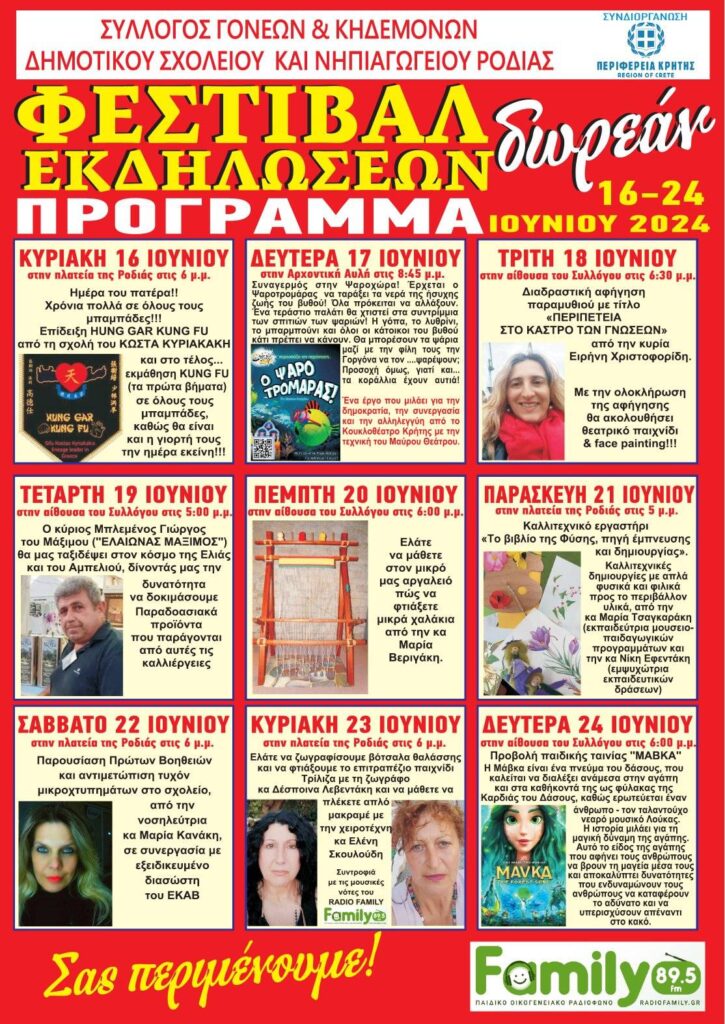 Ο ΣΥΛΛΟΓΟΣ ΓΟΝΕΩΝ & ΚΗΔΕΜΟΝΩΝ ΔΗΜΟΤΙΚΟΥ ΣΧΟΛΕΙΟΥ & ΝΗΠΙΑΓΩΓΕΙΟΥ ΡΟΔΙΑΣ ΣΑΣ ΠΡΟΣΚΑΛΕΙ ΣΤΟ ¨ΦΕΣΤΙΒΑΛ ΔΩΡΕΑΝ ΕΚΔΗΛΩΣΕΩΝ¨ ΠΟΥ ΔΙΟΡΓΑΝΩΝΕΤΑΙ ΣΕ ΣΥΝΕΡΓΑΣΙΑ ΜΕ ΤΗΝ ΠΕΡΙΦΕΡΕΙΑ ΚΡΗΤΗΣ ΚΑΙ ΤΟ FAMILY FM 89,5 KAI ΘΑ ΠΡΑΓΜΑΤΟΠΟΙΗΘΕΙ ΑΠΟ ΤΙΣ 16/6/2024 – 24/06/2024 ΣΤΗΝ ΡΟΔΙΑ ΜΑΛΕΒΙΖΙΟΥ