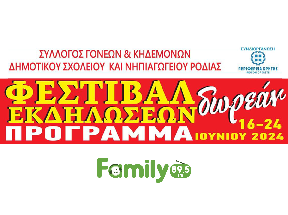 Ο ΣΥΛΛΟΓΟΣ ΓΟΝΕΩΝ & ΚΗΔΕΜΟΝΩΝ ΔΗΜΟΤΙΚΟΥ ΣΧΟΛΕΙΟΥ & ΝΗΠΙΑΓΩΓΕΙΟΥ ΡΟΔΙΑΣ ΣΑΣ ΠΡΟΣΚΑΛΕΙ ΣΤΟ ¨ΦΕΣΤΙΒΑΛ ΔΩΡΕΑΝ ΕΚΔΗΛΩΣΕΩΝ¨ ΠΟΥ ΔΙΟΡΓΑΝΩΝΕΤΑΙ ΣΕ ΣΥΝΕΡΓΑΣΙΑ ΜΕ ΤΗΝ ΠΕΡΙΦΕΡΕΙΑ ΚΡΗΤΗΣ ΚΑΙ ΤΟ FAMILY FM 89,5 KAI ΘΑ ΠΡΑΓΜΑΤΟΠΟΙΗΘΕΙ ΑΠΟ ΤΙΣ 16/6/2024 – 24/06/2024 ΣΤΗΝ ΡΟΔΙΑ ΜΑΛΕΒΙΖΙΟΥ