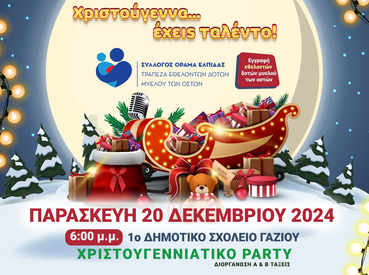 Την Παρασκευή 20 Δεκεμβρίου 2024 και ώρα 6 το απόγευμα, θα πραγματοποιηθεί ένα διαφορετικό Χριστουγεννιάτικο Party στο 1ο Δημοτικό Σχολείο Γαζίου!
