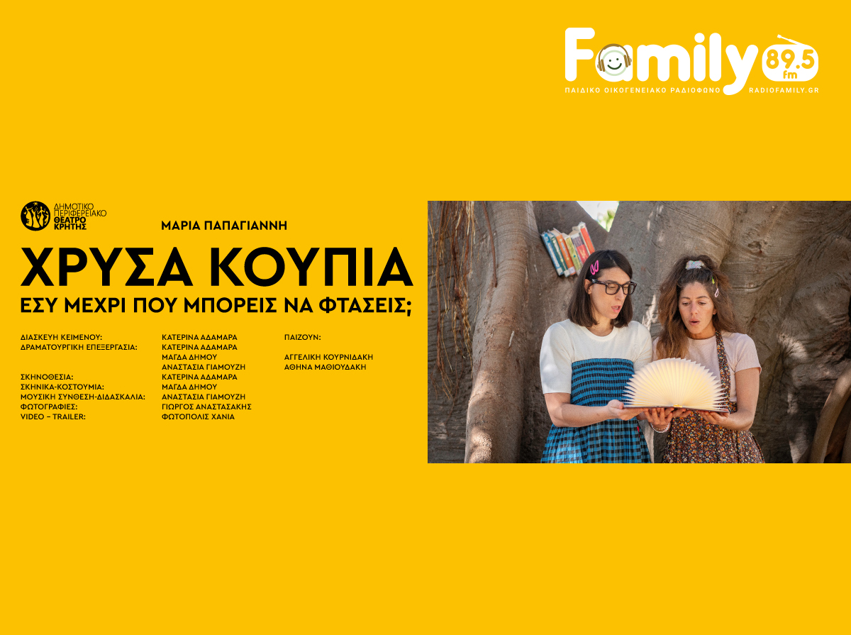 Η παιδική παράσταση «ΧΡΥΣΑ ΚΟΥΠΙΑ – Εσύ μέχρι πού μπορείς να φτάσεις;» μια διασκευή του βιβλίου της Μαρίας Παπαγιάννη «Χρυσά κουπιά», παραγωγή του Δημοτικού Περιφερειακού Θεάτρου Κρήτης για το χειμώνα του 2024, θα βρίσκεται στο Ηράκλειο στις 30/11 και 1/12/2024.σε σκηνοθεσία Κατερίνας Αδαμάρα.