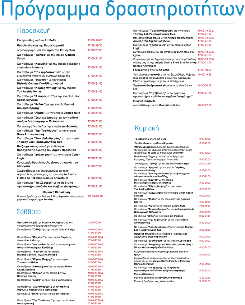 Συμμετέχουν: SKY express, Βιομηχανία και επεξεργασία ξύλου Κοπιδάκης, Μινωικές Γραμμές, Παγωτό Κουβίδης, Σύνδεσμος Ηλεκτρολόγων Εγκαταστατών Νομού Ηρακλείου, Συνεταιρισμένα φαρμακεία Μέλη του Συφάκ, Candia Nuts, Irini hotels, Metrographics, Nana Beach, Trade up, Tsakiris Mallas, Το Καφεδάκι μου, InstrumAudio, Creta Cava, Praktiker, Trade Up, Xbs Ξυλούρης, Αναψυκτικά Γεράνι, Αναψυκτικά Ψηλορείτης, Ανθοκηπευτική Βεκράκης, Γραφικές Τέχνες Πολύτροπο, ΔΕΥΑΗ, Εκδόσεις Άγκυρα, Εκδόσεις Μίνωας, Εκδόσεις Ψυχογιός, Ηλεκτρολογικό Υλικό & Ηλεκτρολογικά Είδη Μεϊδάνης, Ηλεκτρολογικό Υλικό ΚΑΥΚΑΣ, ΙΕΚ ΑΚΜΗ, Κάκτους center Αλέξανδρος Παπαδάκης, Καλουδάκης τροφοδοσίες, Λίτινας Prints, Μπουκέτο Μπαλόνια, Πάγoς Μάρκετ, Ρωμαίος Επιγραφές, Φυτώρια Δήμας, Φυσικό Μεταλλικό Νερό ΖΑΡΟΣ