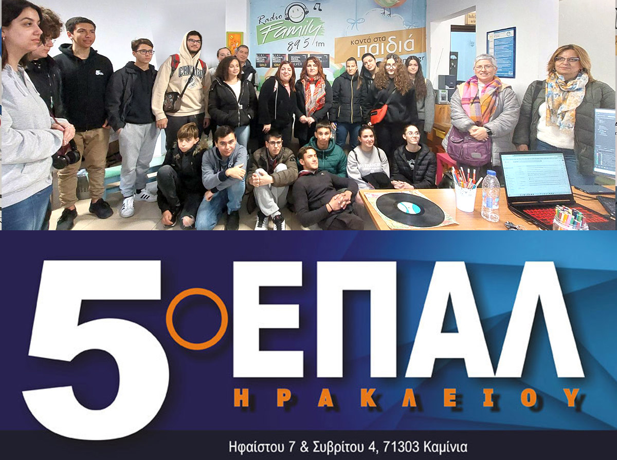 Η περιβαλλοντική ομάδα του 5ου ΕΠΑΛ ,του προγράμματος “Φωτοσκιαστικά ακτινομπερδέματα” συνέχισε τις δράσεις της με επίσκεψη την 01 Μαρτίου 2024 στον παιδικό οικογενειακό ραδιοφωνικό σταθμό “Family 89.5 fm”, όπου γνώρισε τις πραγματικές συνθήκες ενός ραδιοφωνικού προγράμματος, συμμετέχοντας ενεργά και σε απευθείας μετάδοση στις αντίστοιχες εκπομπές του σταθμού.