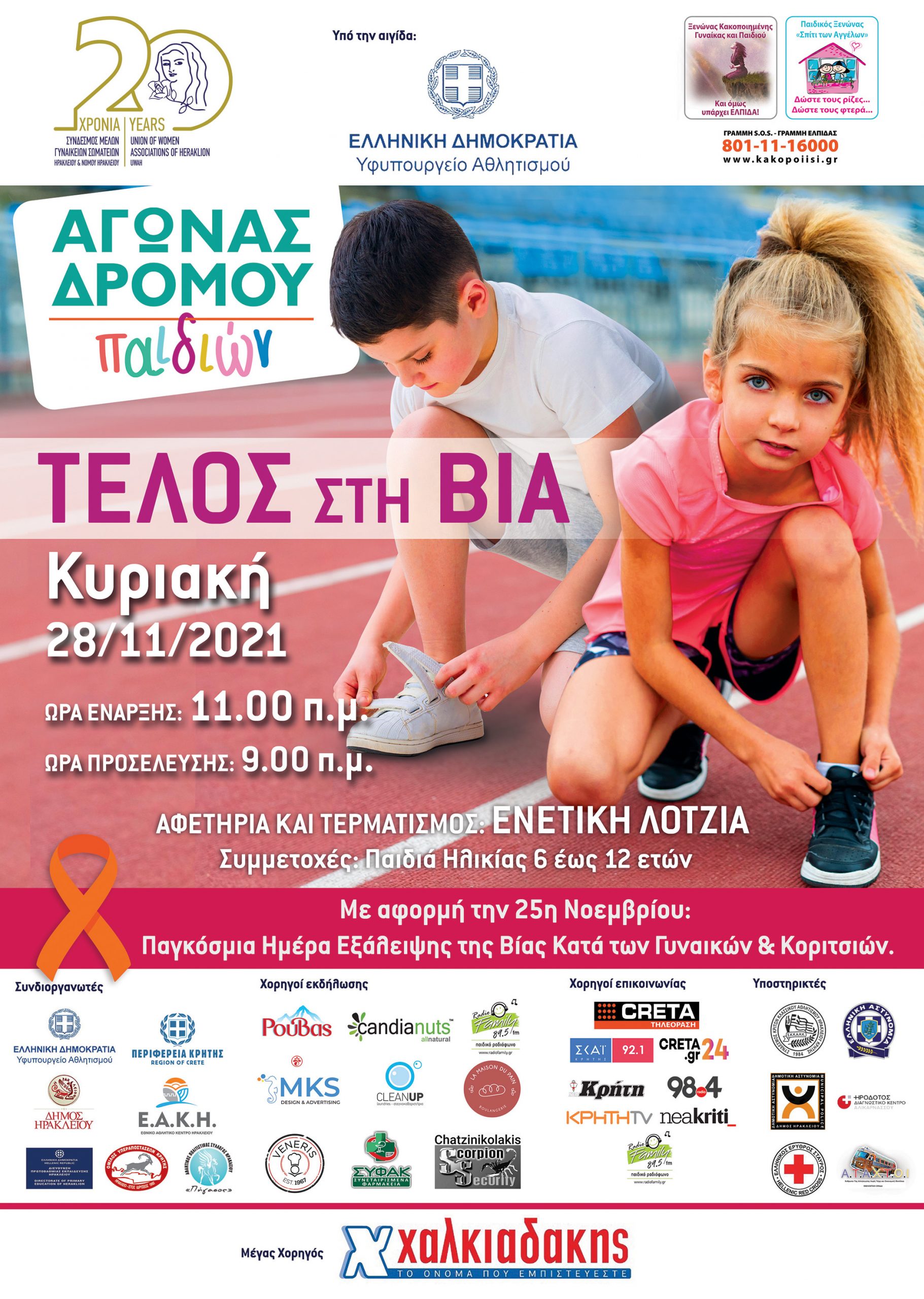 Ο «Σύνδεσμος Μελών Γυναικείων Σωματείων Ηρακλείου & Ν. Ηρακλείου», με αφορμή την Παγκόσμια ημέρα Κατά της Κακοποίησης Γυναικών και Κοριτσιών, συνδιοργανώνει με την Γενική Γραμματεία Αθλητισμού, Υπουργείο Πολιτισμού & Αθλητισμού, την Περιφέρεια Κρήτης, το Δήμο Ηρακλείου, το Εθνικό Αθλητικό Κέντρο Ηρακλείου, την Διεύθυνση Πρωτοβάθμιας Εκπαίδευσης Ηρακλείου, το Αθλητικό Σωματείο Πήγασος και τον Όμιλο Υπεραποστάσεων Κρήτης αγώνα δρόμου παιδιών(ηλικίας 6 έως 12 ετών) κατά της βίας με σύνθημα:
