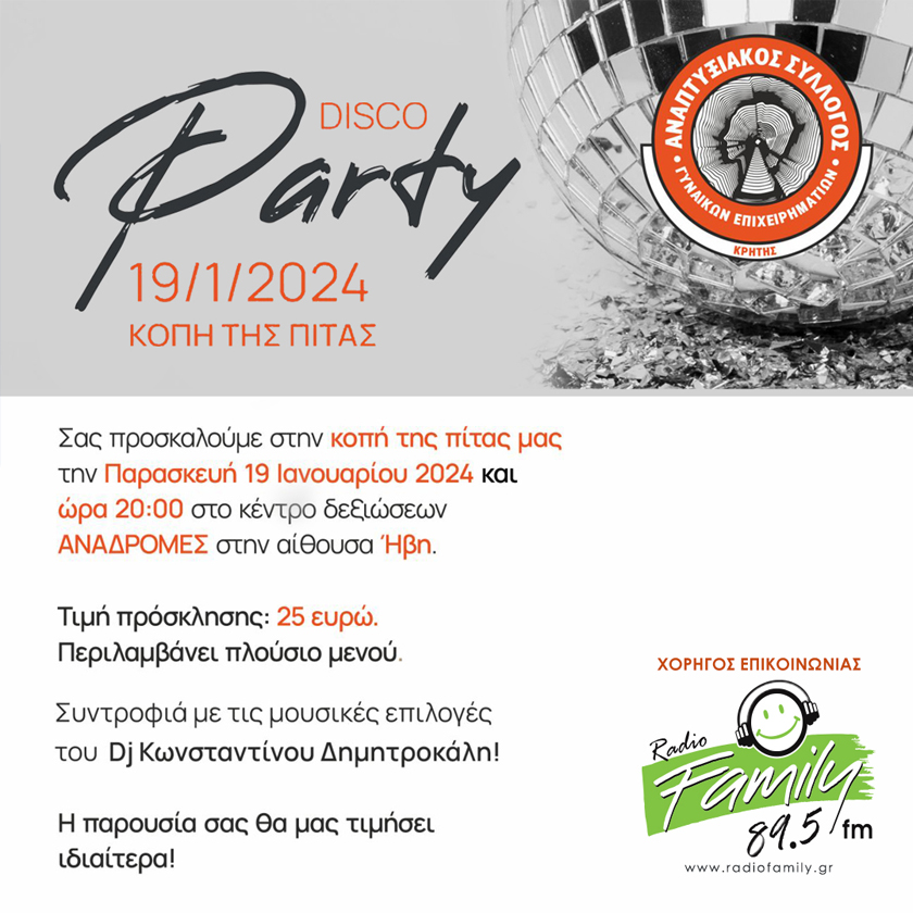 Πλούσιο μενού και δώρα, και Disco Party με τον DJ Κων/νο Δημητροκάλη.