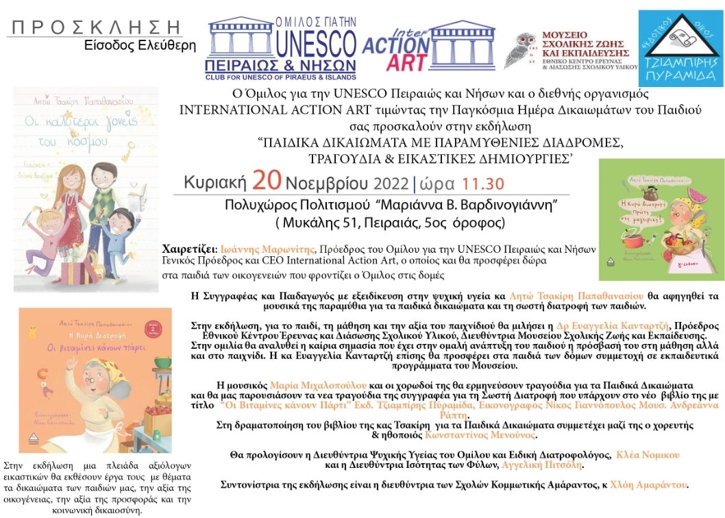 Στα πλαίσια των δράσεων για την Παγκόσμια Ημέρα Δικαιωμάτων του Παιδιού την Κυριακή 20 Νοεμβρίου ώρα 11:30 το πρωί στη νέα δομή του ομίλου για την UNESCO Πειραιώς και Νήσων στην οδό Μυκάλης στα Καμίνια στην αίθουσα εκδηλώσεων “Μαριάννα Βαρδινογιάννη” θα υλοποιηθεί μεγάλη εκδήλωση με πλήθος αξιόλογων συντελεστών.