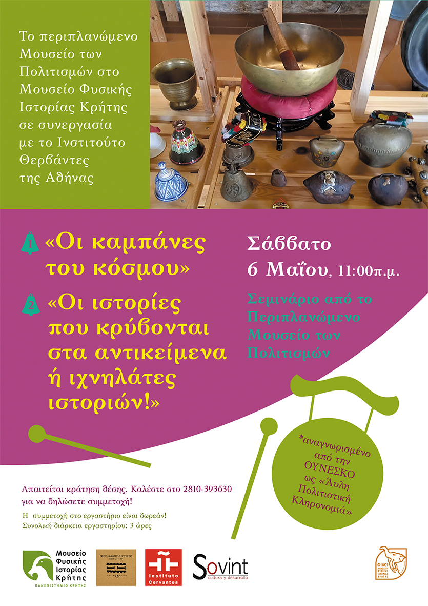 Το Μουσείο Φυσικής Ιστορίας Κρήτης υποδέχεται το Περιπλανώμενο Μουσείο των Πολιτισμών το Σάββατο 6 Μαΐου, στις 11:00π.μ. Ο Pep Beltran (για ‘μας Πέπε) και η Πετρίνα Βάσσου, απευθυνόμενοι σε εκπαιδευτικούς, καλλιτέχνες και ενήλικες με περιέργεια, παρουσιάζουν την έκθεση «Οι καμπάνες του κόσμου» και αμέσως μετά ακολουθεί το πρωτότυπο σεμινάριο/εργαστήριο