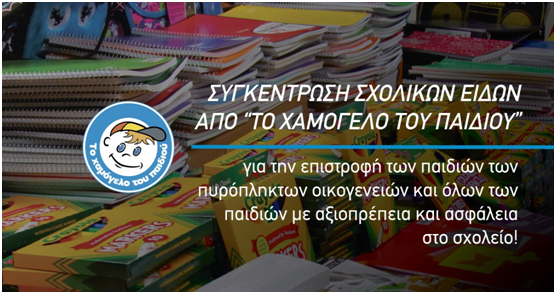 «Το Χαμόγελο του Παιδιού», την περσινή χρονιά κάλυψε τις σχολικές ανάγκες 4.424 μαθητών χάρη στη δική σας θερμή ανταπόκριση. Για μία ακόμη χρονιά, διοργανώνει πανελλαδική εκστρατεία συγκέντρωσης σχολικών ειδών για τα παιδιά, τόσο των οικογενειών που επλήγησαν από τις πρόσφατες καταστροφικές πυρκαγιές, όσο και των οικογενειών που αδυνατούν να καλύψουν τις συγκεκριμένες ανάγκες και μας καλεί όλους να συνδράμουμε και φέτος για να ξεκινήσει η σχολική χρονιά με αξιοπρέπεια, ασφάλεια και χαμόγελα!