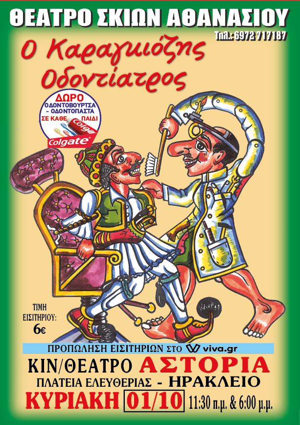 «Ο Καραγκιόζης Οδοντίατρος» που θα πραγματοποιηθεί στο Κιν/θεατρο Αστόρια , στην Πλατεία Ελευθερίας, την Κυριακή 1 Οκτωβρίου ,
