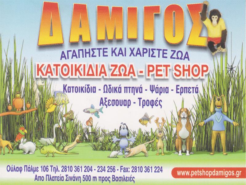 Στο pet shop Damigos φτιάξαμε ένα χώρο για τους μικρούς, μεγάλους, τριχωτούς ή μη, φίλους μας προκειμένου να μη λείψει τίποτα από τη καθημερινότητα και τις ανάγκες τους. Στο κατάστημά μας μπορείτε να βρείτε: ζωοτροφές, σκυλοτροφές, γατοτροφές, διακοσμητικά πουλιά, οδικά πουλιά, παπαγάλους, ψάρια κρύου νερού, ερπετά, τροπικά ψάρια και φυσικά σκυλάκια, γατάκια αλλά και τρωκτικά. Είμαστε σίγουροι πως μέσα από την μεγάλη γκάμα διαφόρων αξεσουάρ τα οποία διαθέτουμε θα βρείτε το καταλληλότερο για το ζωάκι σας από λουράκια και παιχνίδια, μέχρι ενυδρεία και κλουβιά. Σας περιμένουμε στο κατάστημά σας και είμαστε σίγουροι πως μπορούμε να κάνουμε και εσάς και το κατοικίδιό σας χαρούμενους!