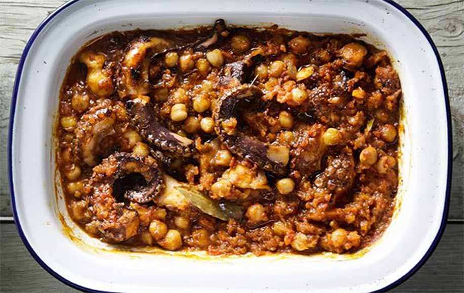 Σιγοβράζετε το φαγητό για 5 λεπτά περίπου και προσθέτετε τα ρεβίθια. Αφήνετε να πάρει μια βράση και μετά ρίχνετε το φαγητό σε πυρίμαχο σκεύος (προτιμότερο να είναι πήλινο). Αν ο ζωμός του φαγητού δεν σκεπάζει τα ρεβίθια και το χταπόδι, προσθέτετε λίγο από το ζωμό των ρεβιθιών που φυλάξατε ώστε να σκεπαστεί το φαγητό.
