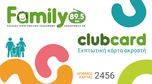 Αγαπητοί ακροατές, δημιουργήσαμε για εσάς εντελώς δωρεάν την Family club Card. Η κάρτα του σταθμού της καρδιάς σας είναι εδώ και σας προσφέρει ειδικές παροχές & εκπτώσεις κάθε μέρα, από τις επιχειρήσεις που συμμετέχουν. Έχετε ειδικές τιμές και προνόμια με την επίδειξη της κάρτας ή με την έκφραση “ακούω και εγώ Family“, κατά την προσέλευσή σας στην εταιρεία που συνεργάζεται με το παιδικό οικογενειακό ραδιόφωνο Family 89.5 f.